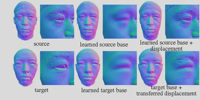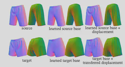 One advantage of using classic displacement mapping to create surface details is that once the mapping, known as surface parameterization, from the base surface to the height map is created, the displacement is independent of deformations of the base surface. We emulate this effect for IDF by replacing the coordinates input to the displacement net, which is obviously non-transferable as it’s bound to the global coordinate frame, with transferable features.